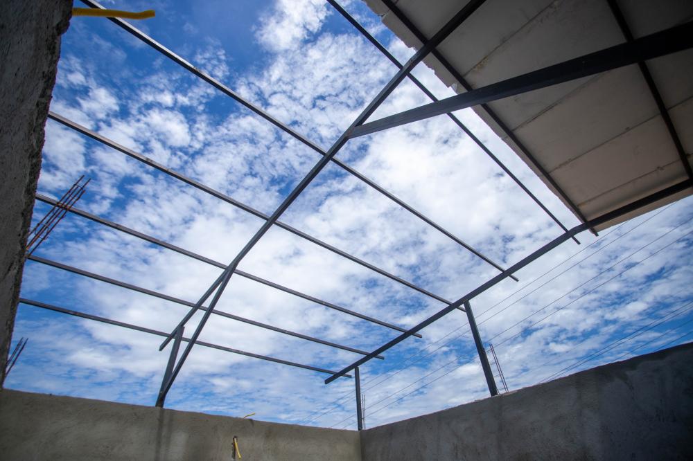 A reforma inclui a substituição do antigo telhado por telhas termoacústicas, que garantem melhor isolamento térmico e acústico, além da instalação de calhas e pintura protetiva. O projeto também contempla melhorias estruturais para assegurar o correto escoamento da água da chuva, aumentando a durabilidade e a segurança do prédio escolar.
