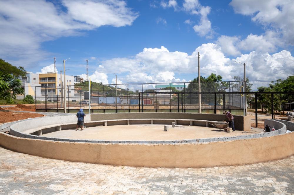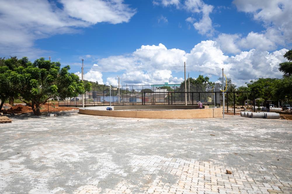 Além das estruturas de convivência, as obras também avançam na preparação das áreas destinadas à arborização. Esses espaços estão sendo construídos para receber o plantio de árvores, contribuindo para o sombreamento, o conforto térmico e a valorização ambiental da praça.