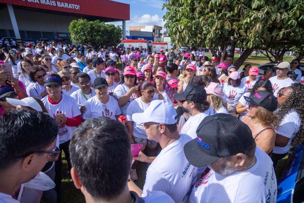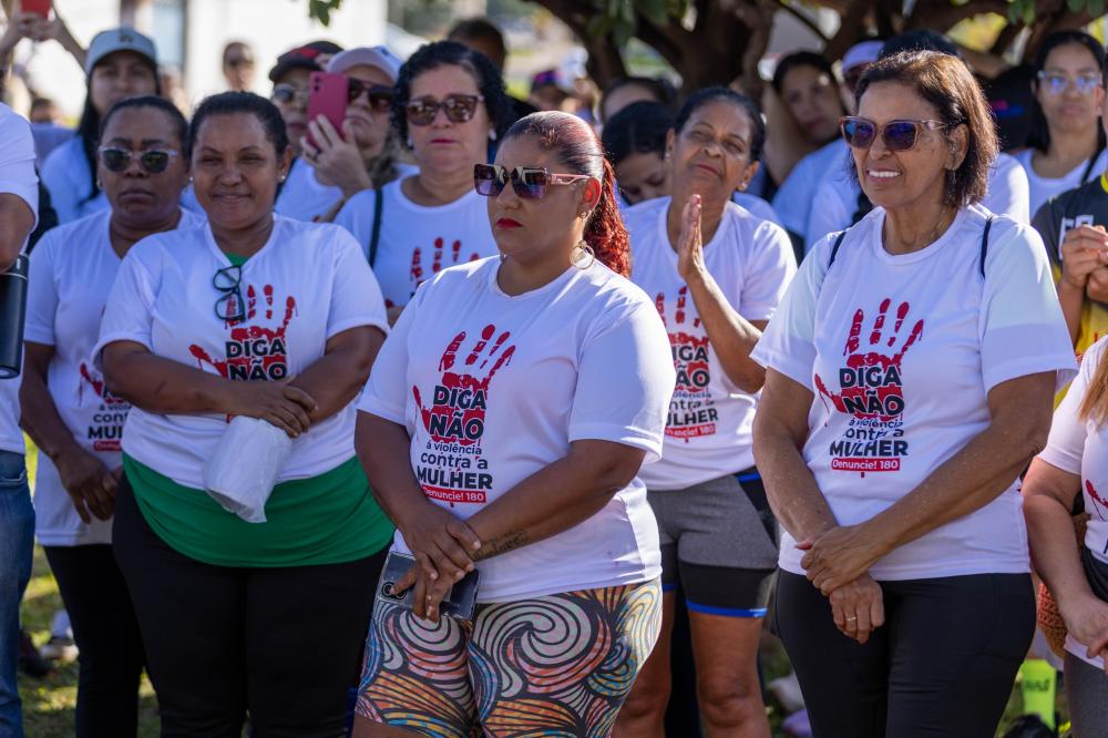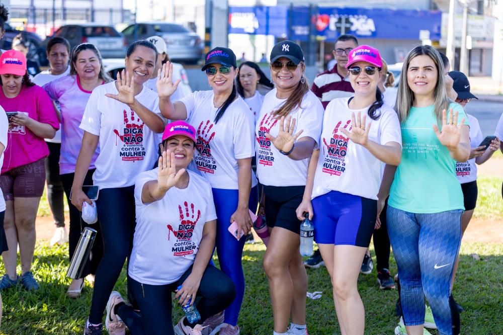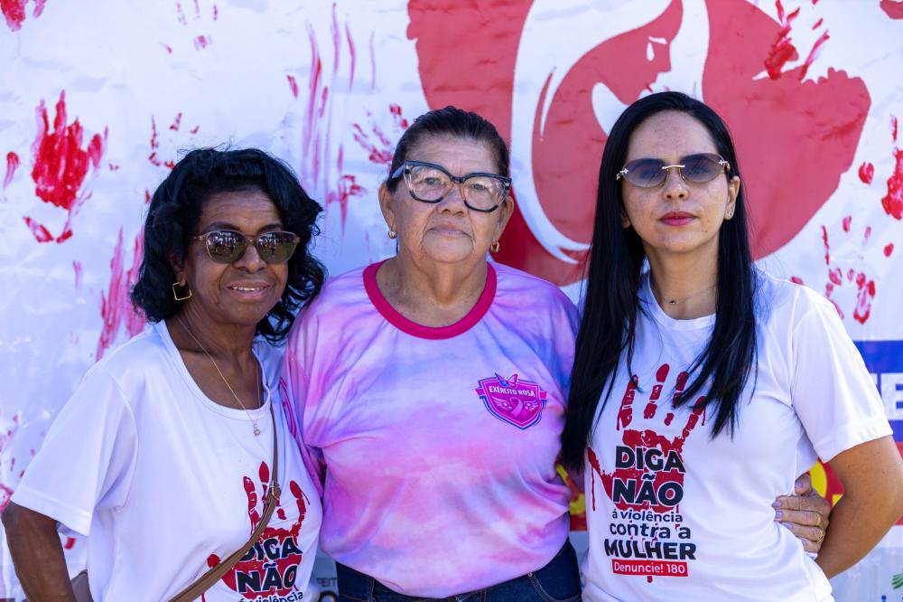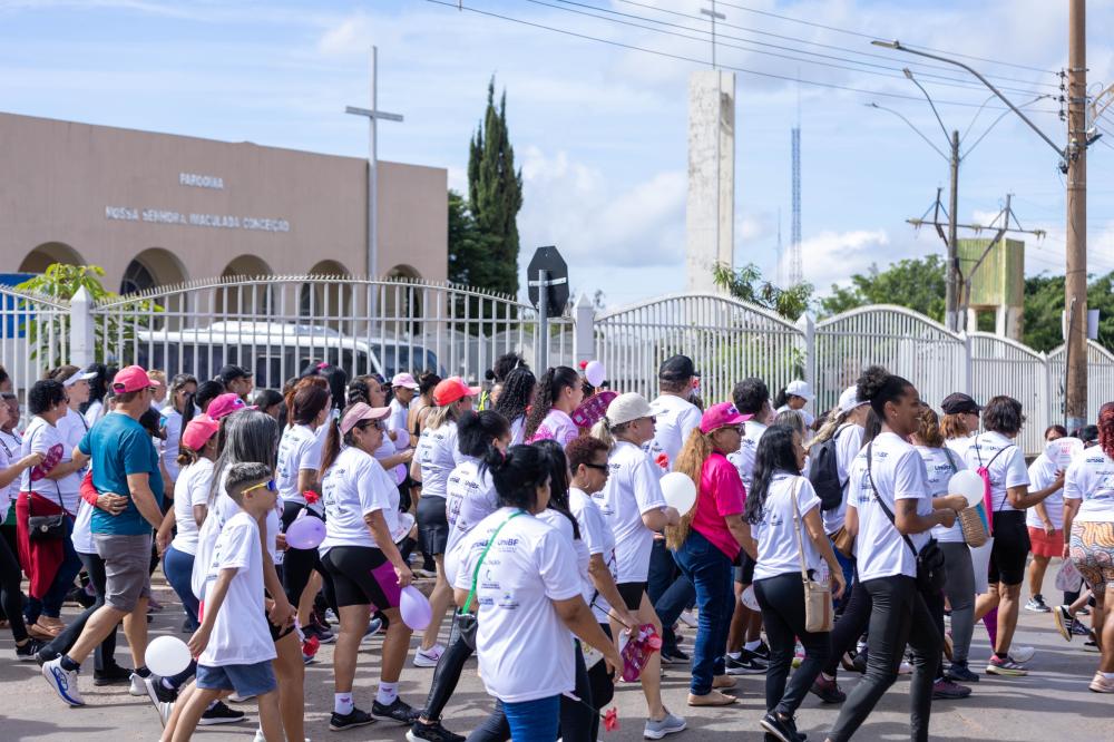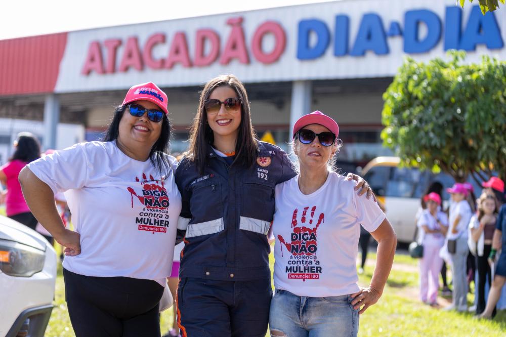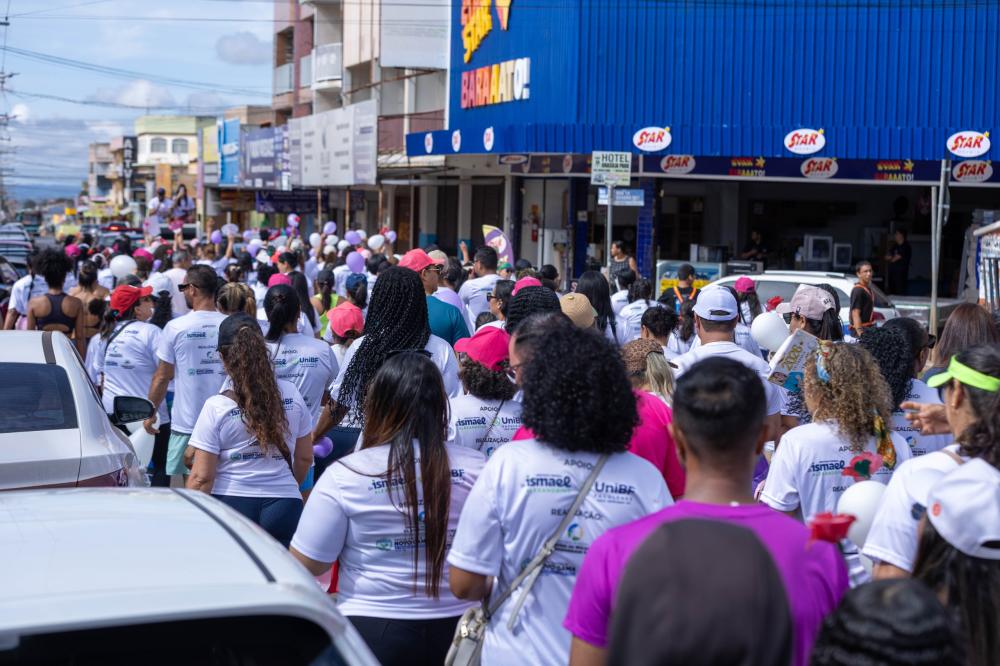 A mobilização teve início em frente ao Atacadão Dia a Dia e seguiu em caminhada até a Igreja Nossa Senhora Imaculada Conceição, marcando um percurso simbólico de união, reflexão e fortalecimento da luta pelo respeito e pelos direitos das mulheres.