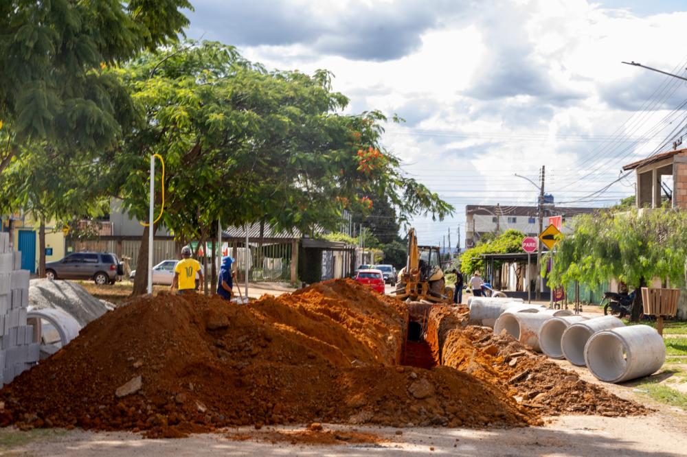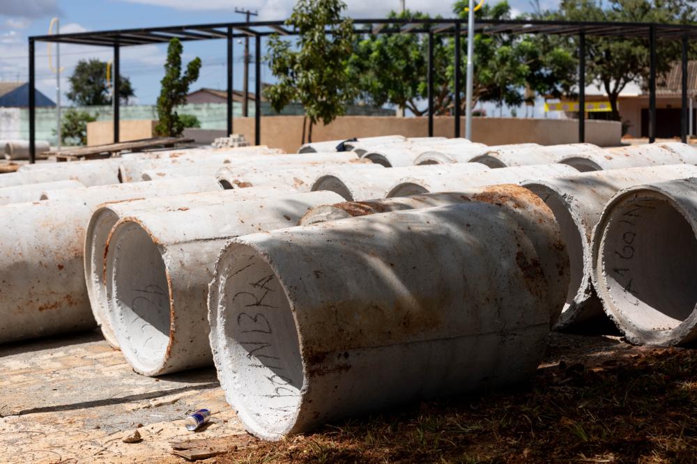 Paralelamente, também está sendo executado o sistema de drenagem do local. A instalação das manilhas para o escoamento da água da chuva já está em andamento, etapa fundamental para garantir o bom funcionamento